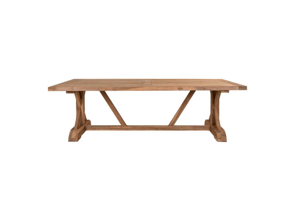 S čistou hmotností 80 kg se jedná o mimořádně masivní stůl. Teakové dřevo je zde zpracováno tak, aby vynikla jeho přirozená krása a struktura. „Vintage“ úprava dodává stolu pocit, že už má svůj příběh, což z něj činí dokonalý středobod pro rodinná sídla nebo prostorné moderní domy.
