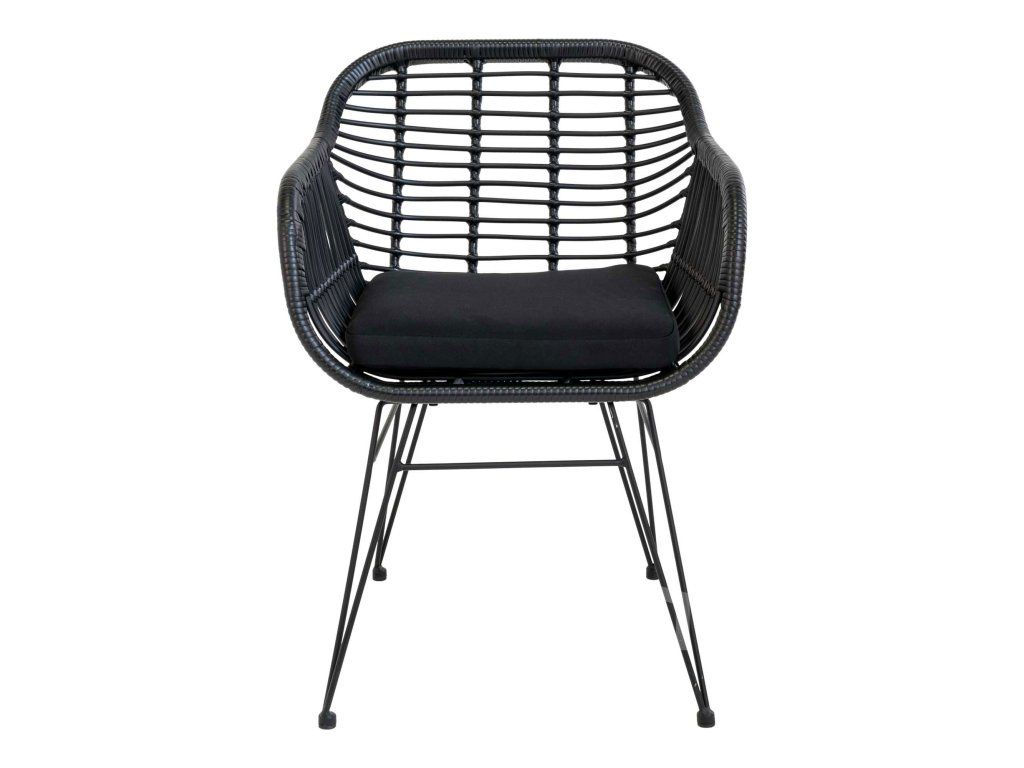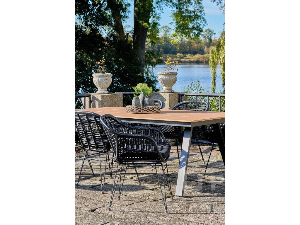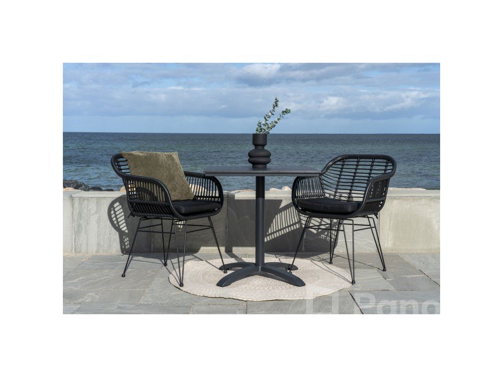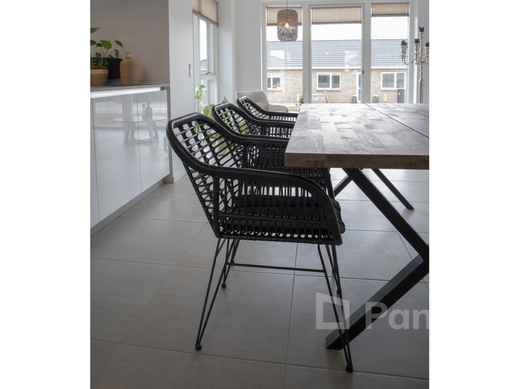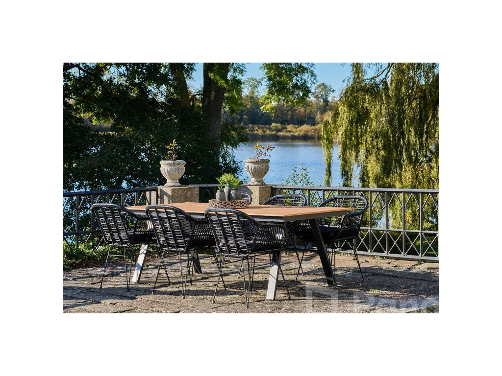 Dodejte svému stolování hloubku a texturu s křeslem Trieste. Toto křeslo mistrovsky kombinuje organický vzhled polyratanu s přísnými liniemi černé kovové podnože. Výsledkem je nadčasový kousek, který nabízí komfort křesla a praktičnost jídelní židle, ideální pro moderní interiéry i kryté exteriéry.