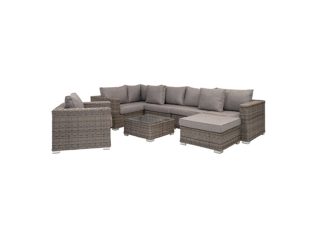Materiál: PE ratan, ocel (rám), tvrzené sklo (5 mm), polyester (polstry)