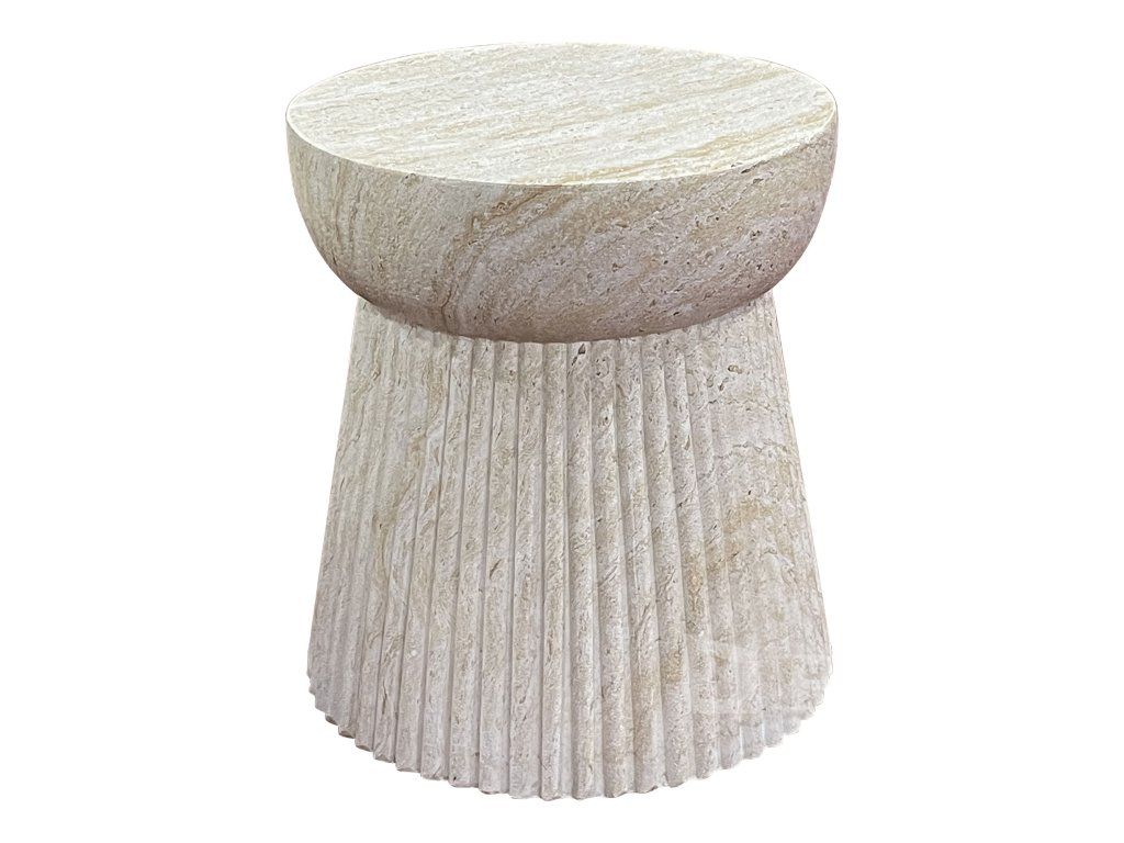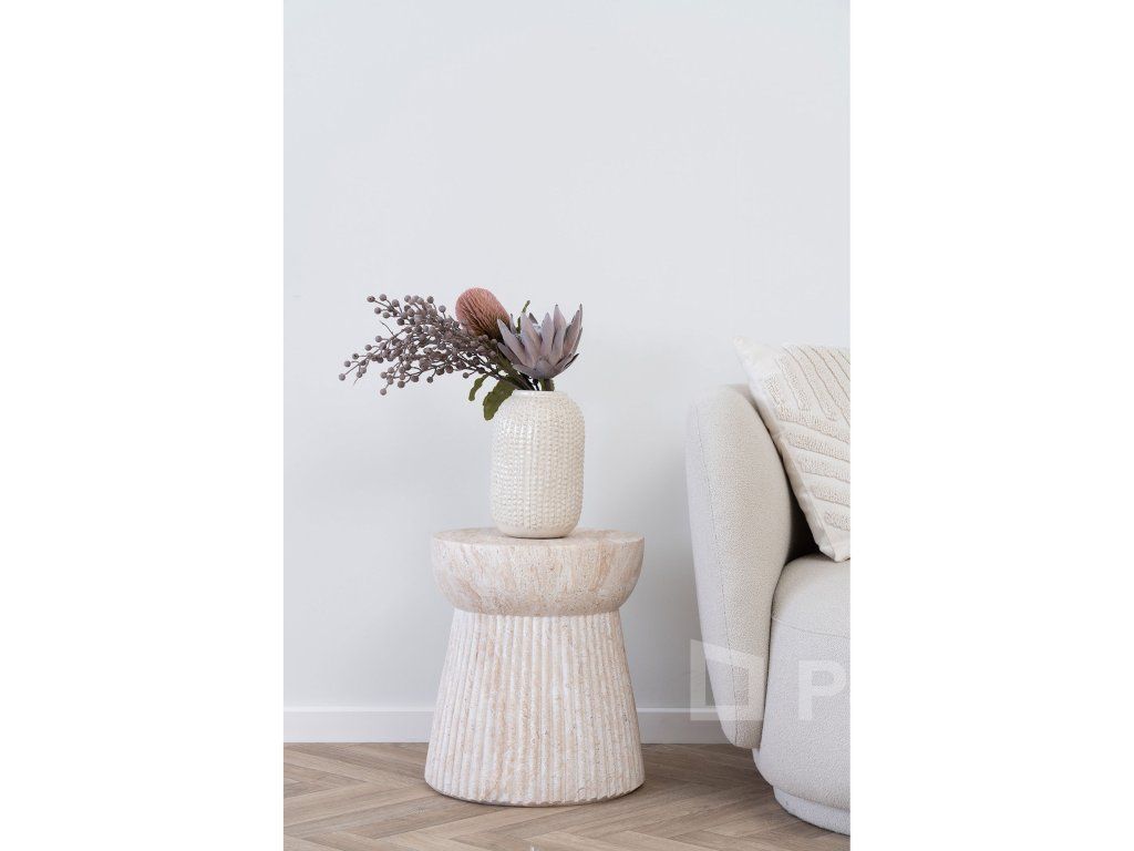 Stolek Bonn je vizuálně podmanivý kousek, který sází na jeden z největších trendů současného designu – drážkovanou strukturu. Díky svému monolitickému válcovému tvaru a jemnému pískovému odstínu (Natural) nepůsobí jen jako nábytek, ale spíše jako architektonický doplněk, který dodá vaší terase hloubku a charakter.