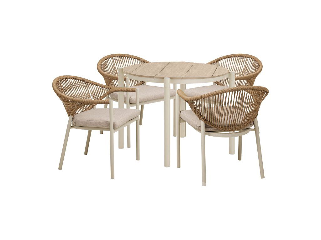 Set Abela je ideálním řešením pro menší terasy, městské balkony nebo útulná zahradní zákoutí. Pozůstává ze čtvercového stolu a čtyř ergonomicky tvarovaných židlí, které spojuje jednotné barevné schéma Sand/Natural (písková/přírodní). Tento set působí lehce, vzdušně a do prostoru vnáší příjemnou přímořskou atmosféru.