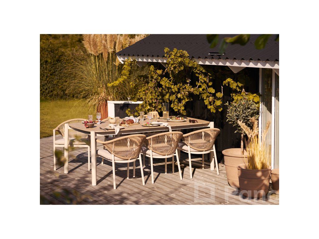 Zatímco menší verze Abela byla určena pro intimnější posezení, tento set s délkou stolu 200 cm promění vaši zahradu v plnohodnotnou venkovní jídelnu. Nabízí stejný vizuální šarm přírodního ratanu v pískovém odstínu, ale s velkorysou plochou, která pohodlně usadí 6 až 8 osob.