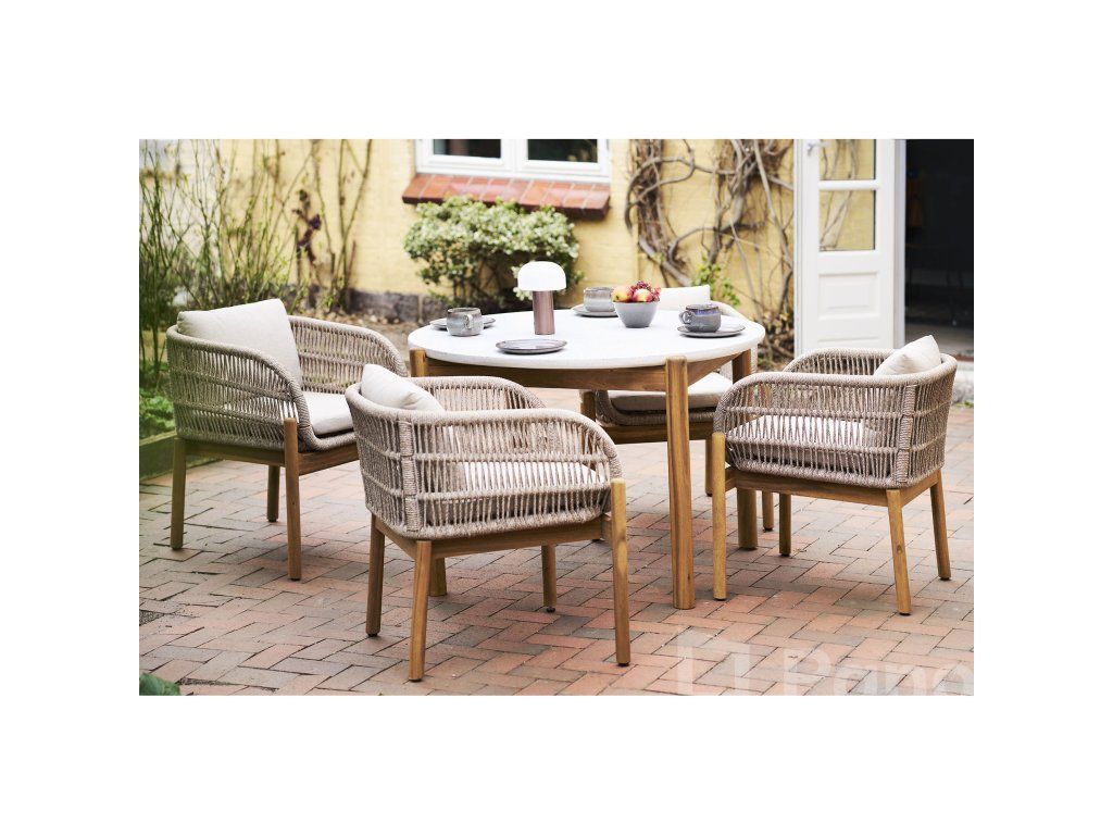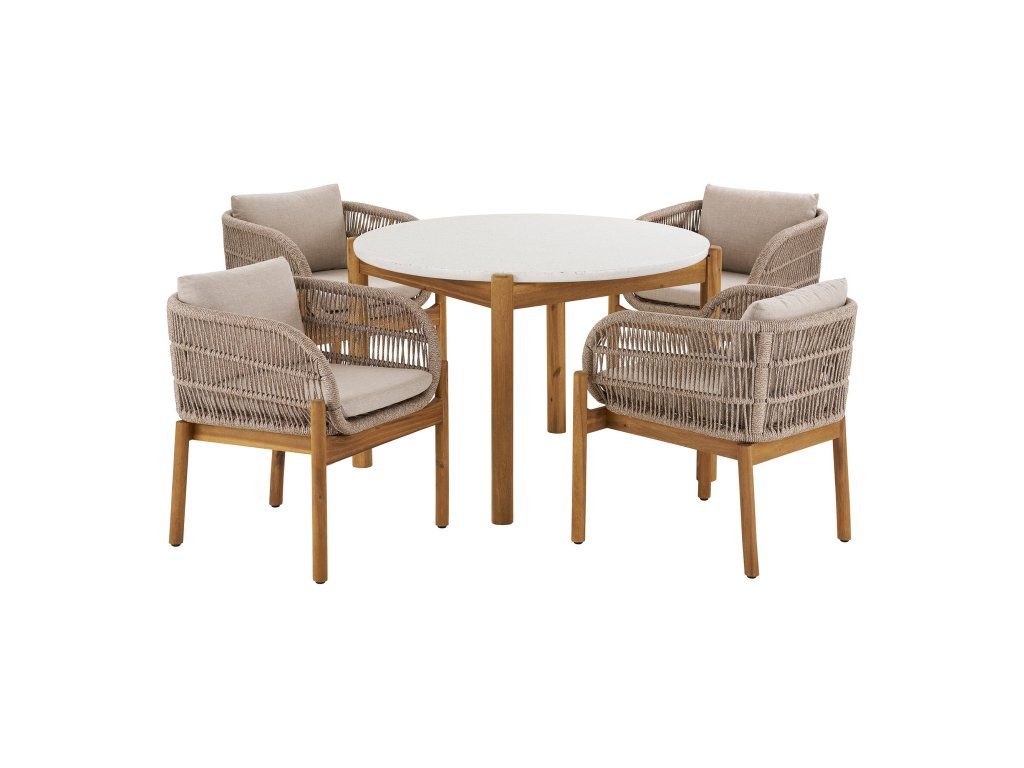 Set Terracina pro 4 osoby je navržen pro ty, kteří hledají výjimečný vizuální zážitek bez kompromisů v kvalitě. Centrem setu je robustní kulatý stůl, který doplňují čtyři designové židle. Kombinace hnědého akáciového dřeva a béžového výpletu (rope) vytváří teplou, luxusní atmosféru, která okamžitě povýší každou terasu na úroveň přímořské rezidence.